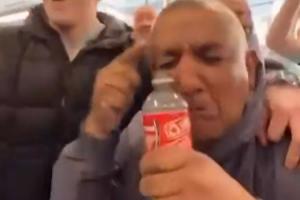 赛后曼城球迷“水瓶哥”拧开瓶盖,接起了眼泪嘲讽。